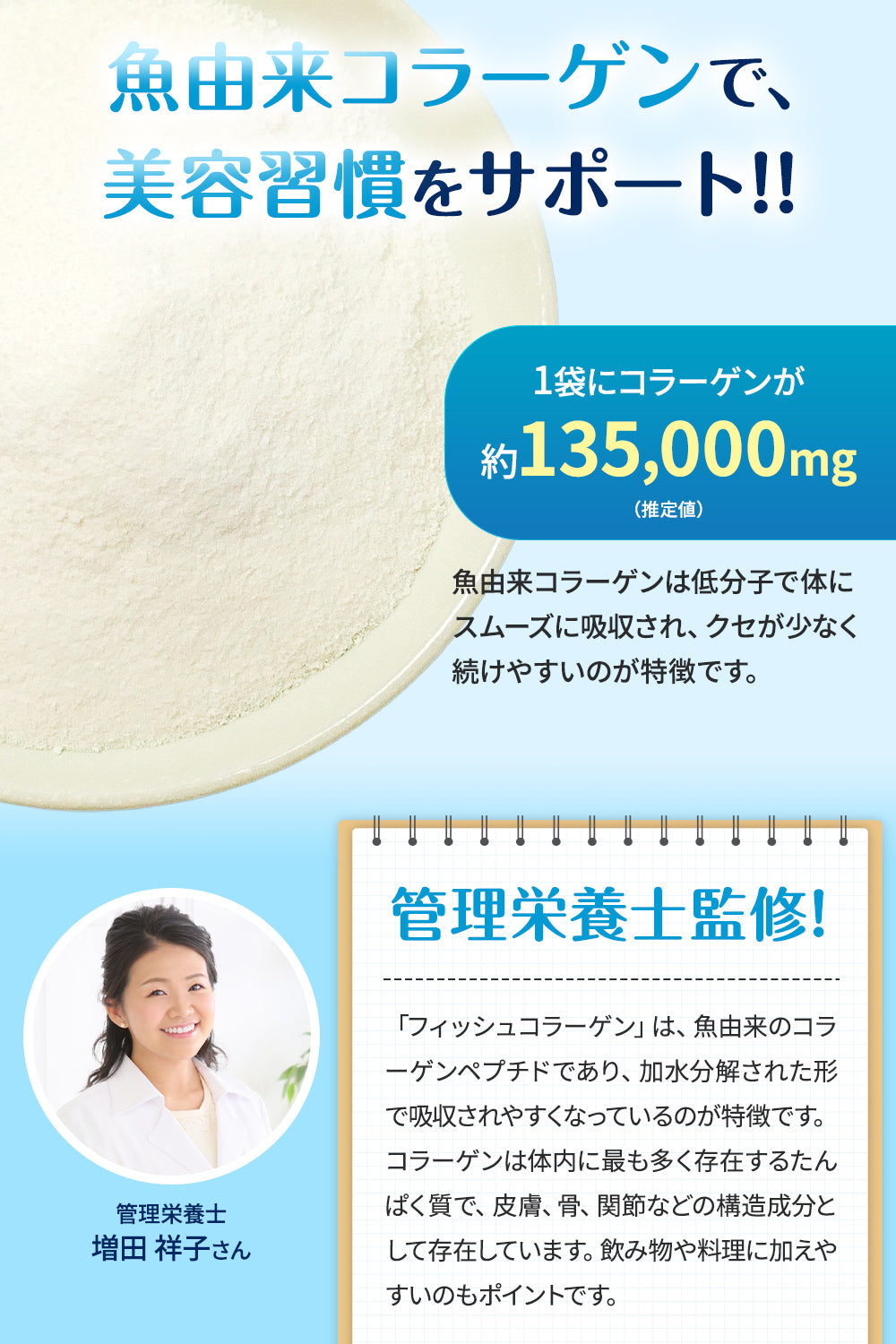 原料は魚由来のコラーゲンのみ。無添加・無着色・無香料で、サッと溶けて使いやすいフィッシュコラーゲンパウダーです。