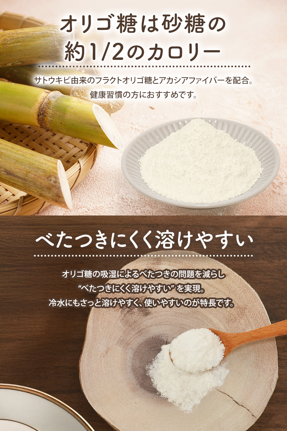 オリゴ糖の吸湿によるベタつきの問題を減らし「べたつきにくく溶けやすい」を実現。