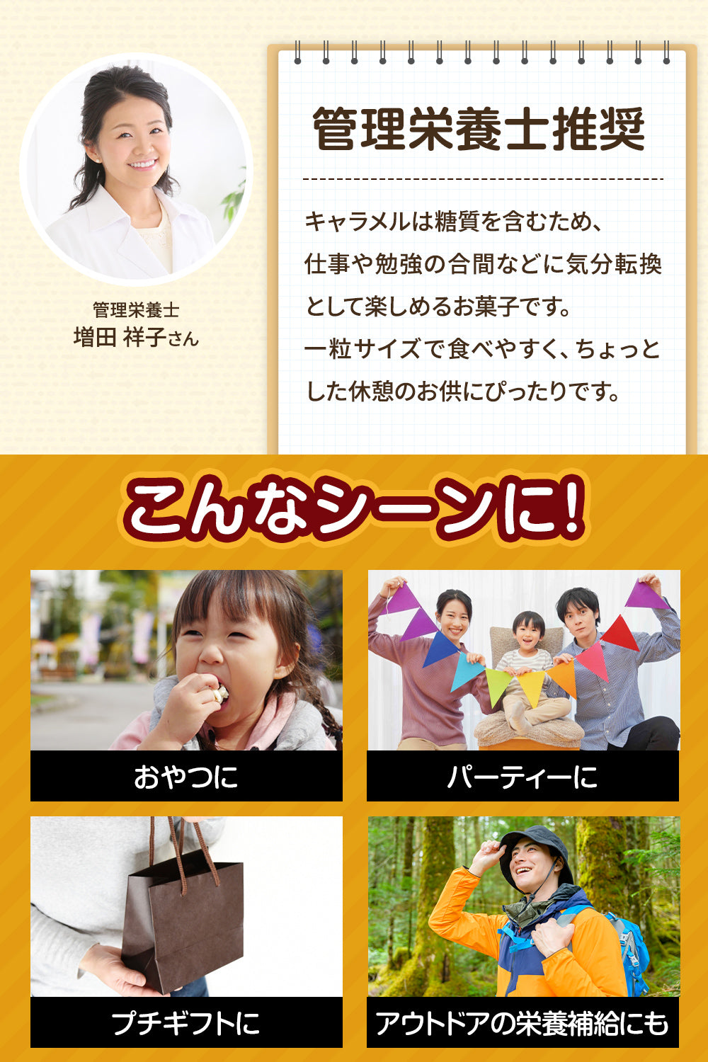 キャラメルは糖質を含むため、仕事や勉強の合間などに気分転換として楽しめるお菓子です。一粒サイズで食べやすく、ちょっとした休憩のお供にぴったりです。